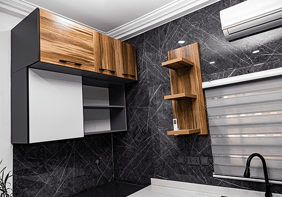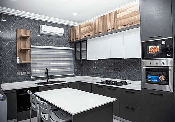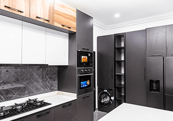 Modern Luxury Kitchen A bold mix of dark marble-look cladding, matte cabinetry, and warm wood tones defines this contemporary kitchen. The central island and integrated appliances complete a design built for both performance and style.