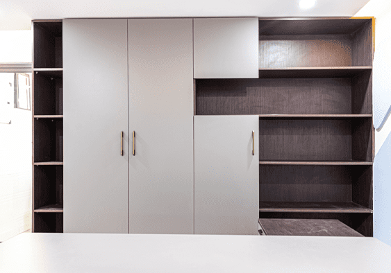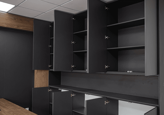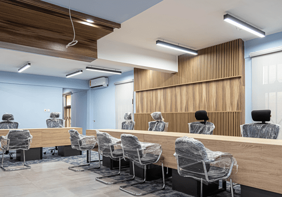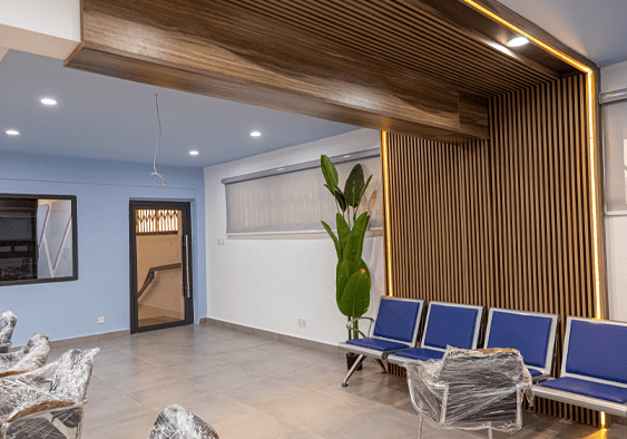 Vanguard Assurance at Tema and East Legon blend professionalism with contemporary design, creating environments that inspire focus and collaboration. From the executive office defined by rich wood tones, matte grey finishes and a light-blue geometric wall, to open-plan workstations with modular desks, glass partitions and warm wood accents, every detail balances form and function.